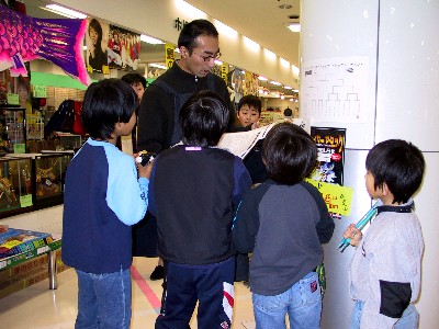 店長さんと一緒に大会規定の確認をしました。 大げさなカスタマイズギアを持ってきた子はいなかったので、車検は省略。