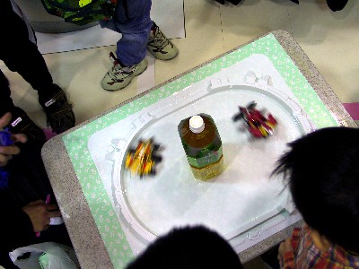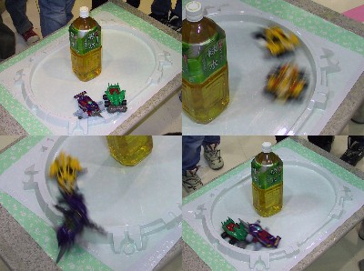 ペットボトル、ギアの邪魔になると思ったのですが、ちゃんとスピンもできるし、意外に面白いバトルになりました。