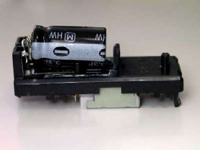 カンデンサー発見!! 正体は「電気二重層コンデンサー」と言います。 電気の貯蔵庫みたいなもので、ニッカドなどの電池とは原理が違います。 このコンデンサーは、3.3F(ファラッド)の容量。 松下製だと思いますが、なぜか耐電圧の表示が無かった。 5.5Vかなぁ・・・ |