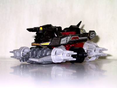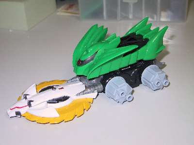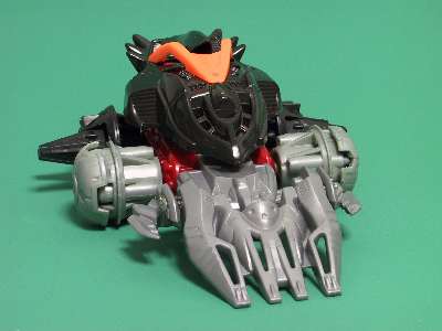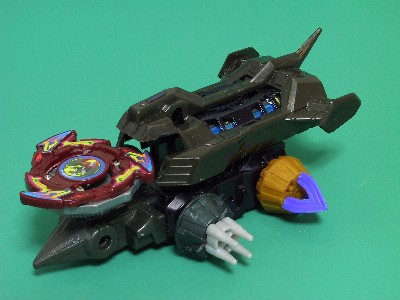 重心移動システム・爆龍爪ライクなフロントウエポンと、非常に鎧輝コンプレックスなマシン。 フロントウエポン部のホイールは、鎧輝と同様回転し相手を巻き上げる。 後輪を大きくし、前傾姿勢をとることで、正面同士のぶつかり合いでは、相手の下に潜り込む。 ダッシュタイプのセッティングで、鎧輝とのバトルでは同等以上の強さ。 |