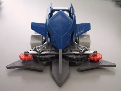 パンツァーバレルにランナー(部品の枠)を利用した触角をセット。 ホイールウエポンを利用した台座に組み付けているので、取り外しが自由。 この触角が左右に激しく動き、触れるものを弾き飛ばす。 壁に触れると、ギアは瞬時に方向をかえる。 触角に触れたときの衝撃は大きく、鎧輝でさえひっくり返してしまうことがある。 |