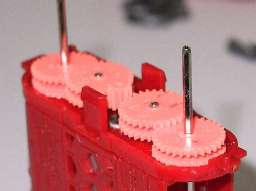 ノーマルギヤーを組み合わせて減速比を大きくとることにより、4輪大径ホイール&重量級FWでも余裕で駆動します。 多分、ギアファイターレギュレーション適合 |